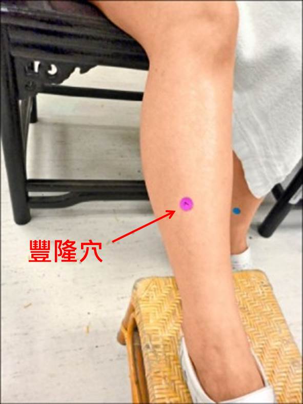3. 豐隆穴:左右足外踝尖與膝眼連線的中間點,脛骨前緣外側。